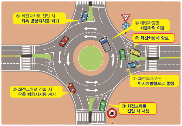 회전교차로의 운행방법은 운전자들이라면 누구나 잘 알 것이다. 반시계 방향으로 통행하고 진입 시 서행 또는 일시 정지한다. 그리고 이미 진행 중인 차량에 진로양보를 한다. 추가로 개정된 법규에서는 회전교차로에 진, 출입 시 손이나 방향지시기 또는 등화로 그 행위가 끝날 때까지 신호를 하여야 한다.
